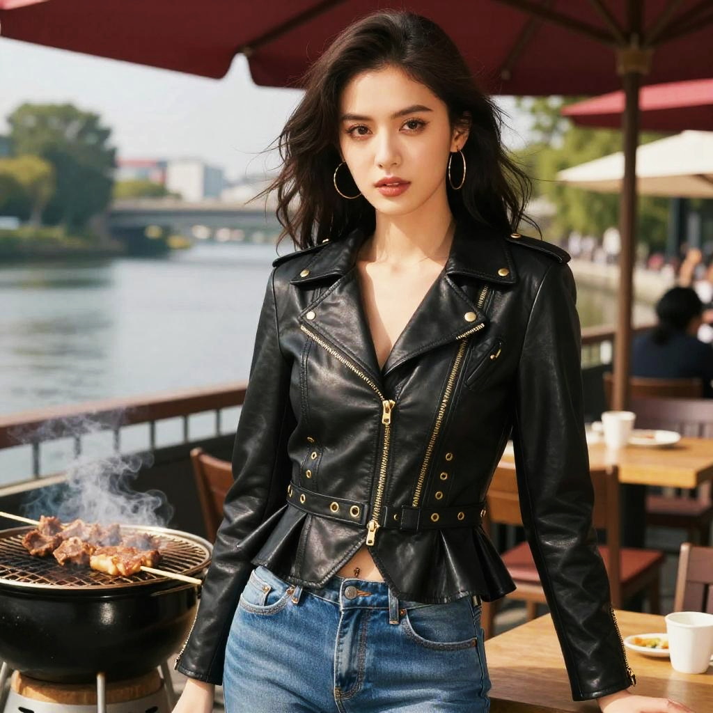 A stylish athletic woman in a modern chic black leather peplum jacket with gold grommet details and blue denim jeans, set against the backdrop of a vibrant hibachi grill at a riverside patio, infused with a Studio Ghibli visual style. Sexy. Pretty face and beutiful eyes
