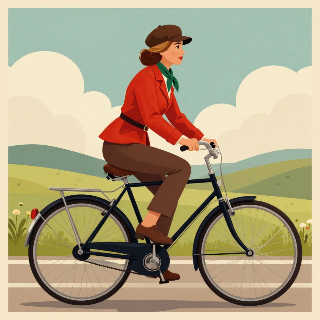 Retro-style vintage poster depicting a woman riding a classic bicycle, dressed in a red jacket, green scarf, and brown cap, set against a serene backdrop of rolling hills and soft clouds.