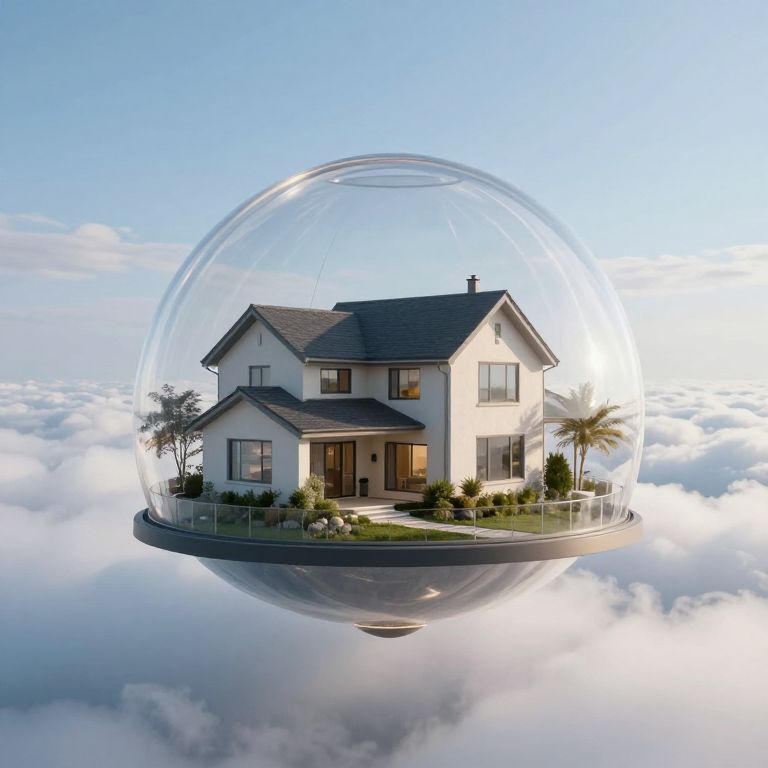 A serene suburban home floats serenely within a transparent glass dome, suspended effortlessly above a sea of fluffy clouds, defying gravity in a dreamlike, otherworldly scene.