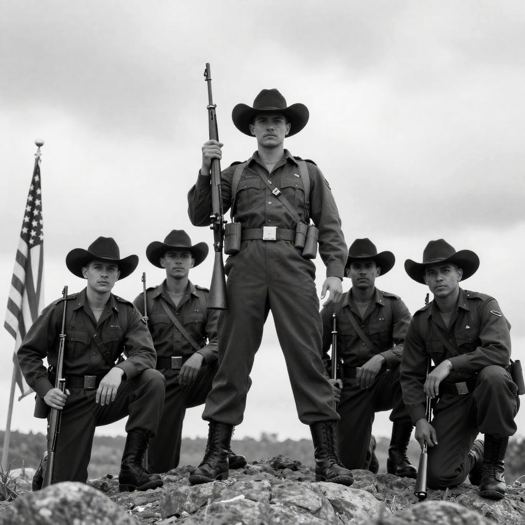Photograph of six soldiers in white helmets with red emblems, brown uniforms, crouching in a sandy, rocky terrain. Four soldiers in the foreground, two in the background. Intense expressions, shadows, and a circular in the bottom right.