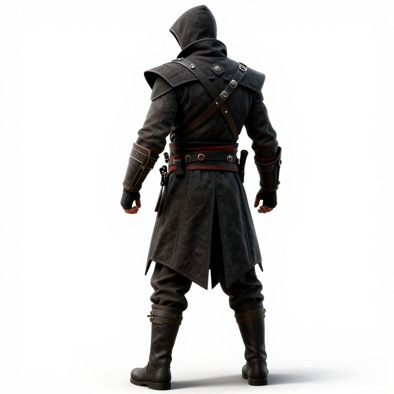 Quilting a tall and very muscular young assassins creed male seen from behind. He has a wide v-taper back and wears a dark uniform. We see his whole body including his thick legs,