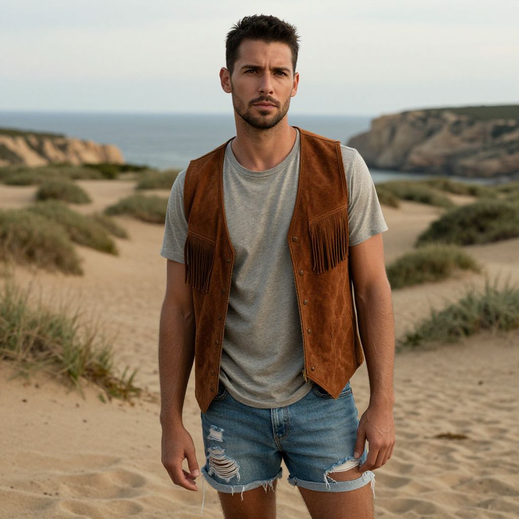 "a man, vintage band tee, distressed denim cutoffs, fringed suede vest, earthy tones, relaxed fit, sandy bunkers, dramatic cliffs, panoramic ocean views, medium format film, contemplative expression. Man has masculine face and piercing eyes"
