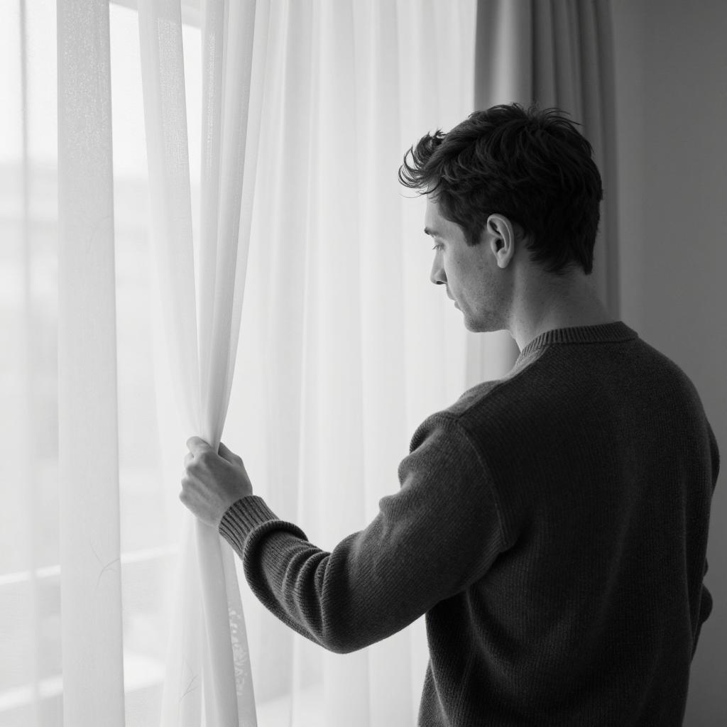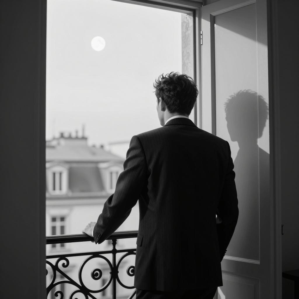 Black-and-white photograph of a man in a pinstripe suit, seen from behind, standing at an open window. He leans against the right wall, shadow cast on it. Cityscape with rooftops visible outside. Moon in sky. Ornate balcony railing below.