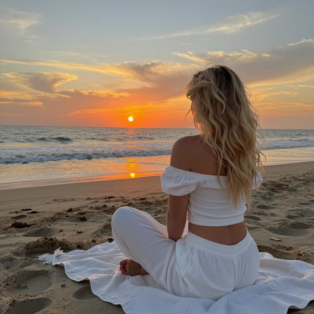 Woman with blonde updo in white, backless, halter dress stands on rocky cliff, holding pink purse and white cloth. Ocean waves in background, sunset with pink and orange sky. Grass and rocks on right, beach on left. Sunset light on water. Woman's back to camera, looking at ocean. Clouds scattered in sky.