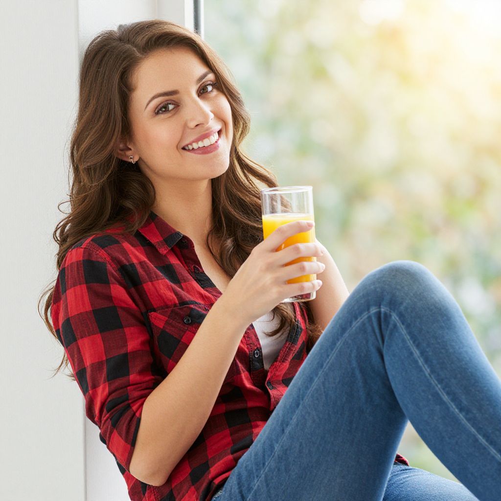 Photograph of a smiling young woman with long, wavy brown hair, wearing a red and black checkered shirt and blue jeans. She is sitting by a window with a blurred, sunny outdoor background. She holds a glass of orange juice in her right hand, slightly raised to her mouth. Her skin is fair, and she has dark, well-groomed eyebrows. The window light highlights her cheerful expression. The image has a bright, natural light feel, emphasizing her relaxed and happy demeanor.