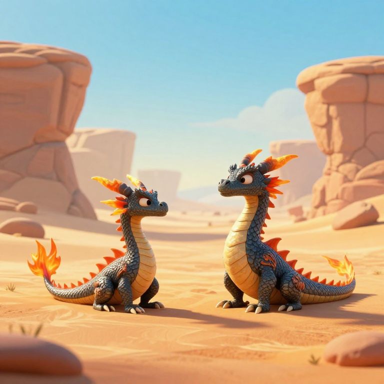 In a serene desert landscape rendered in a vibrant 3D animation style, two whimsical dragons with textured scales and fiery orange accents awaken amidst wind-sculpted rock formations, their shadows cast by golden-hour sunlight adding depth to the tranquil scene.