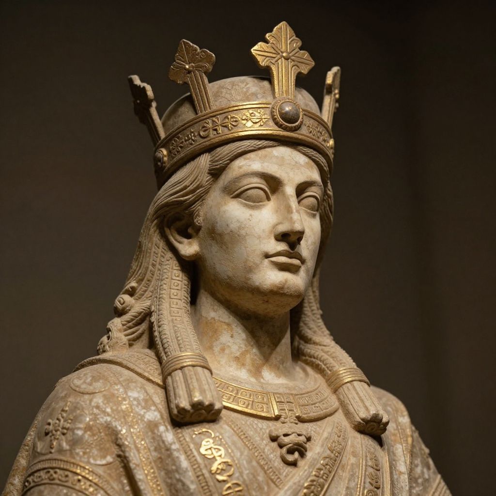 Ancient god costume, a close up of a statue of a man with a crown on his head
