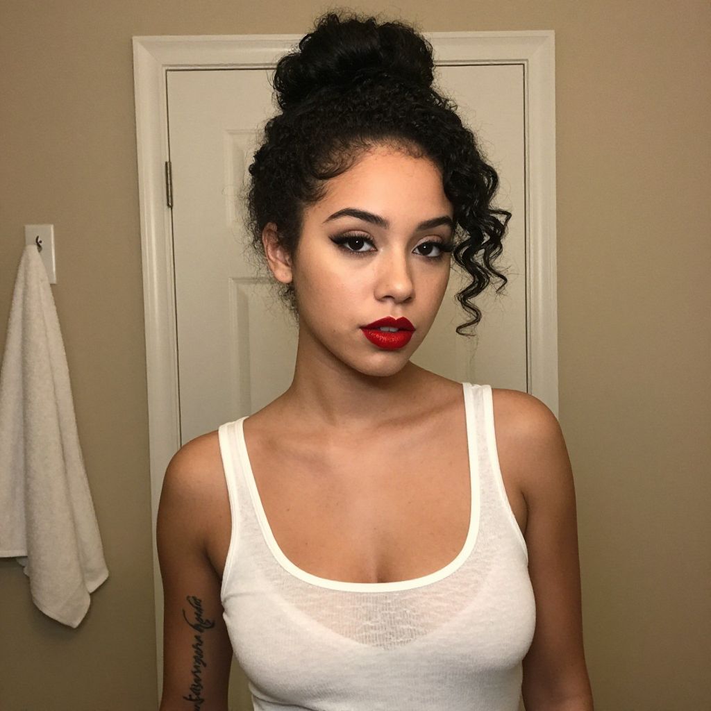 Photograph of a young woman with medium brown skin and curly black hair in a high bun. She's wearing a white, slightly sheer tank top that reveals a hint of cleavage. Her makeup is dramatic with thick eyeliner and bold red lipstick. She has a tattoo with cursive writing on her right upper arm. The background shows a beige bathroom with a door and a white towel hanging on the wall.