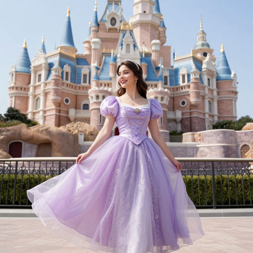 Photograph of a smiling young woman with fair skin and long dark brown hair, wearing a sparkly lavender ball gown with puffed sleeves and a fitted bodice. She stands in front of a fairy tale castle with blue-topped turrets and pink stone walls, under a clear blue sky. Her dress has a flowing, glittery skirt, and she wears a tiara. The background includes a black metal fence and a manicured hedge. The image has a bright, sunny atmosphere, emphasizing the magical, fairytale-like setting.