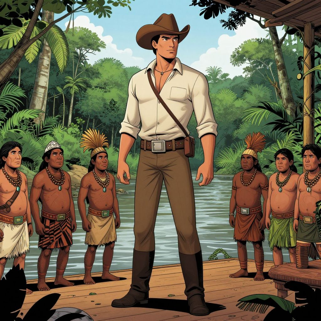 In a comic book style, a tall man in western attire stands on a deck near a river in the Amazon rainforest, surrounded by natives waiting.