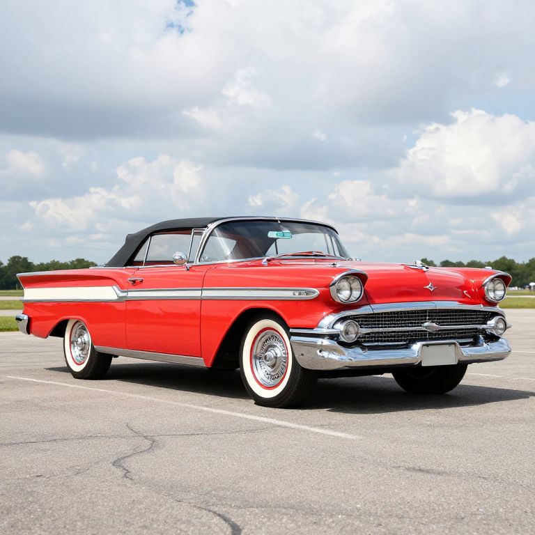 Vibrant 1957 Ford Fairlane 500 Skyliner convertible, painted in classic red and cream with a black soft top, gracefully parked on a paved lot under a partly cloudy sky, showcasing its iconic design and chrome details.