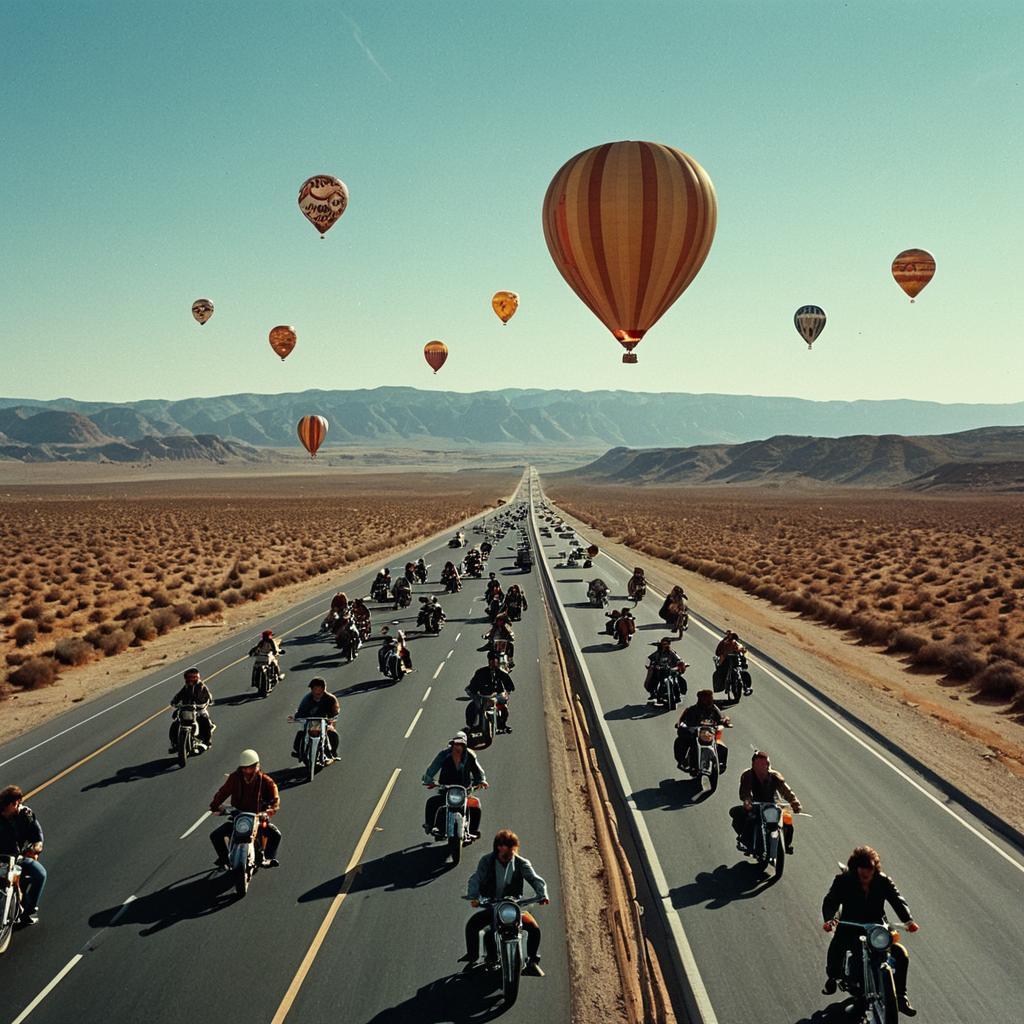 Wide shot of a group of motorcyclists riding on a desert highway under a clear blue sky filled with numerous hot air balloons. The scene captures a 1970s cinematic aesthetic with a large prominent glowing hot air balloon floating above the highway. The motorcyclists wear classic 70s style clothing and helmets as they ride through a barren desert landscape with distant mountains.