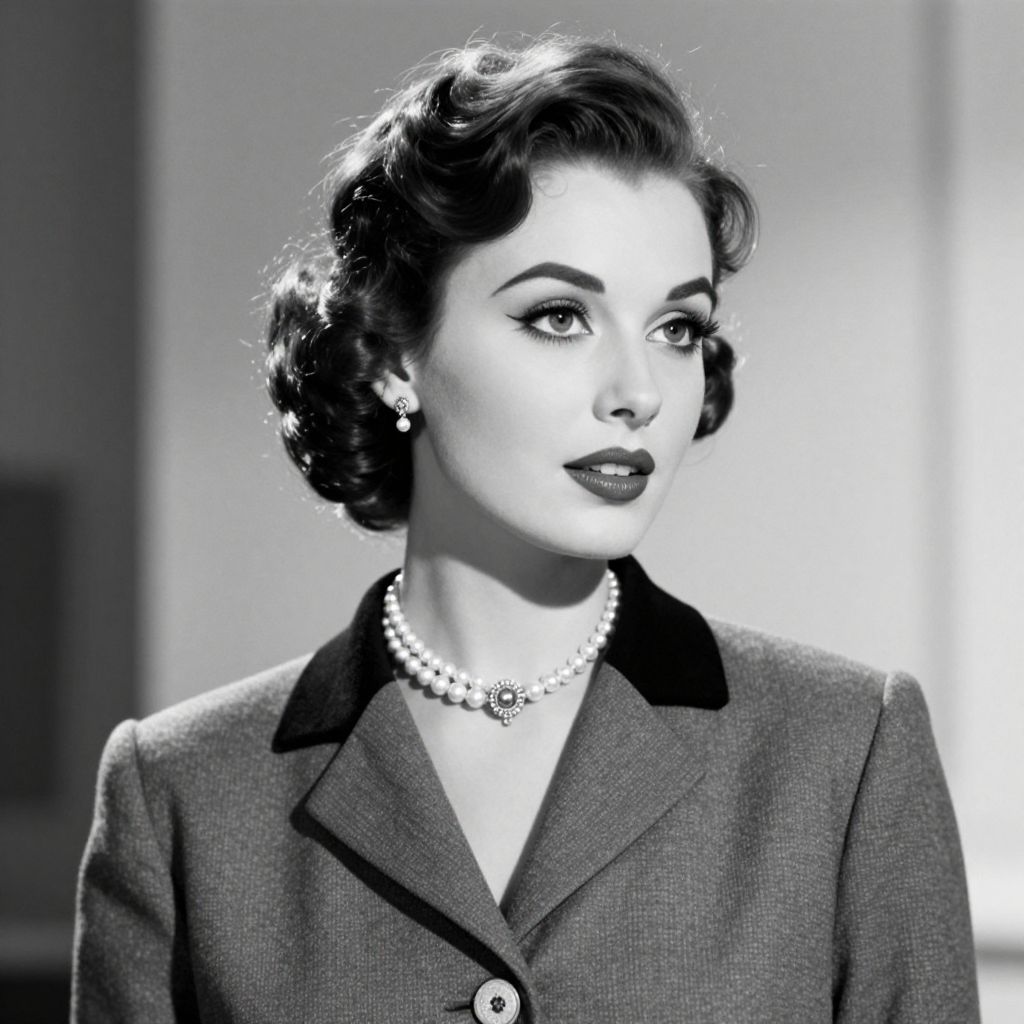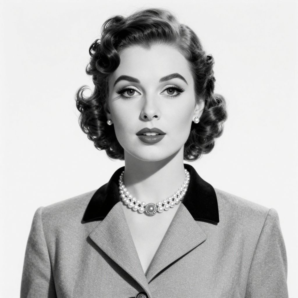 A vintage-inspired digital illustration reminiscent of Chanel's 1957 aesthetic, featuring a woman with elegant curls, pearl jewelry, and a classic blazer, rendered in high-definition black-and-white tones with a timeless, retro charm.