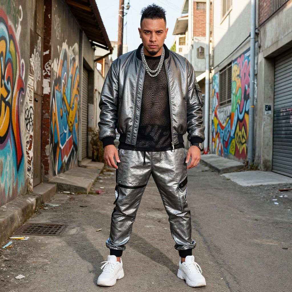 A man, metallic silver bomber jacket, black mesh t-shirt, reflective jogger pants, chunky white sneakers, layered silver chains, vibrant murals, urban decay, sunlit alleyway, hand-tinted photograph, confident expression. Man has masculine face and piercing eyes