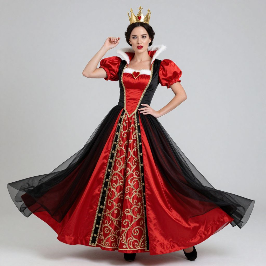 Photograph of a fair-skinned woman dressed as a queen. She wears a red and black, full-length, Renaissance-style gown with puffed red sleeves, a heart-shaped red bodice, and a black and gold patterned skirt. A white fur collar adorns her neck. She dons a gold crown with red jewels and has black hair styled in an updo. Her makeup includes red lipstick. She stands against a plain white background, striking a confident pose with her right arm raised and her left hand on her hip. Black high heels complete her outfit.