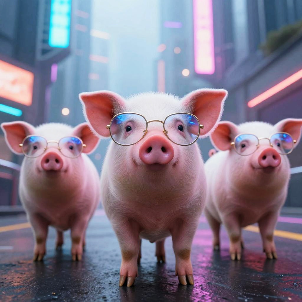 Cute pigs with glasses exploring a futuristic cityscape, neon lights reflecting on their lenses, cyberpunk vibe, detailed textures, dynamic composition