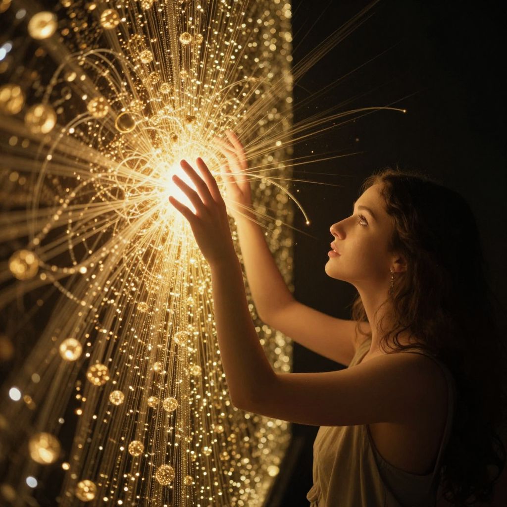 A woman reaches out to touch a shimmering wall of golden orbs, as radiant light-rays cascade from her fingertips, weaving a dreamlike tapestry of luminous energy against the darkened backdrop.