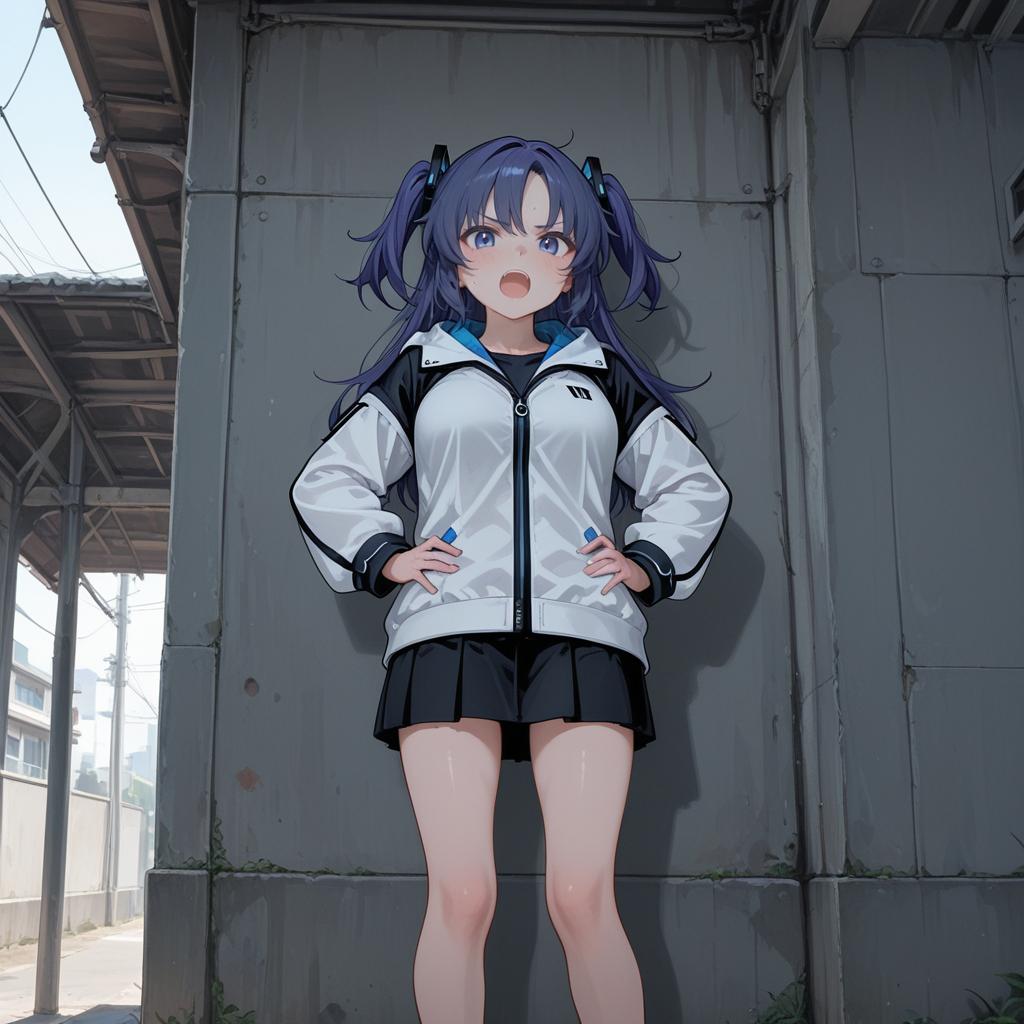 Masterpiece, best quality, ultra-detailed, 1girl, yuuka, default, white jacket, black jacket, standing, hands on hip, miniskirt, angry, open mouth