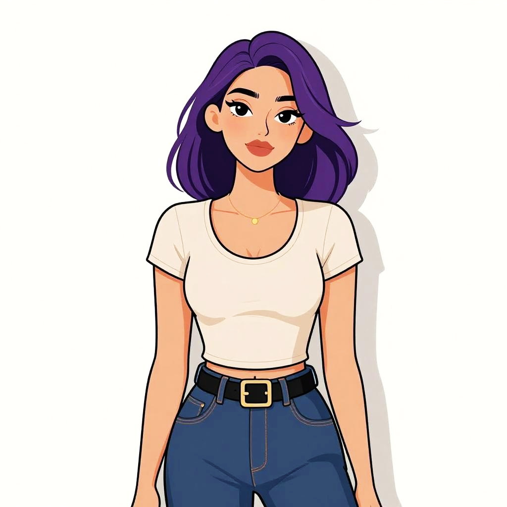 Woman with pretty face and pretty hair. Woman, casual, fitted beige scoop-neck t-shirt, short sleeves, thin gold necklace, high-waisted dark blue jeans, prominent black belt, large square buckle, plain white wall background. --sref 1467