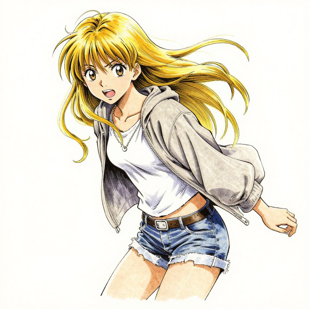 This is a vibrant, digital anime-style illustration of a young woman with long, flowing yellow-blonde hair and large, expressive brown eyes. She is smiling with an open-mouthed, cheerful expression. She wears a white, slightly loose-fitting t-shirt, a beige, hooded jacket with the hood down, and blue, frayed denim shorts with a brown belt. Her right hand is slightly raised, and her left arm rests by her side. The background is completely white, making the colorful character stand out. The image uses bold, clean lines and bright, contrasting colors typical of anime art.