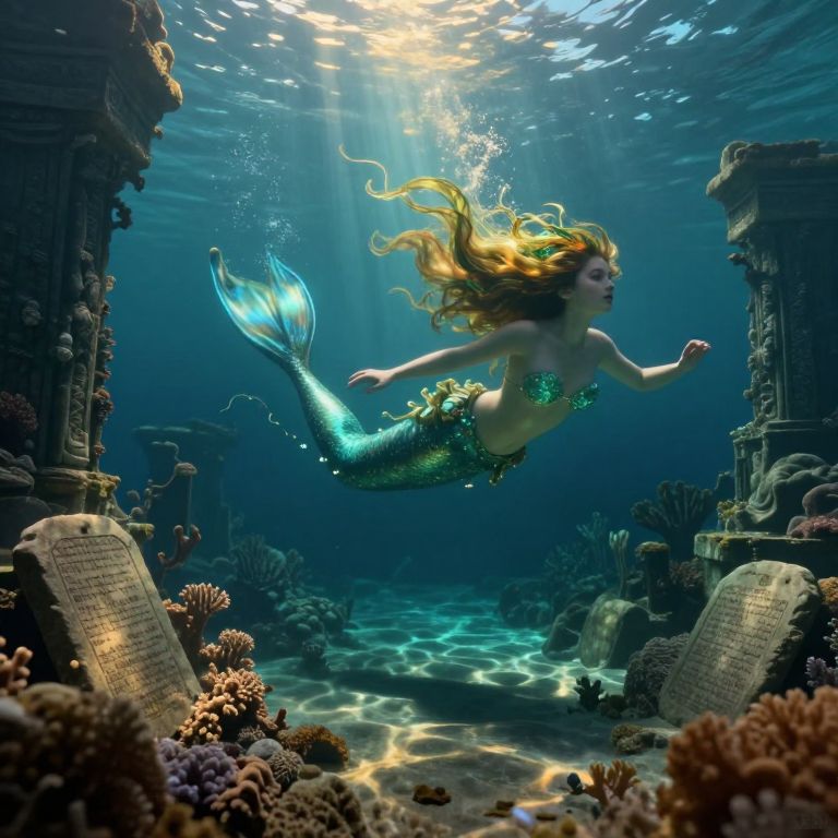 Craft an image in the enchanting manner of Victorian fantasy painters, portraying a mesmerizing underwater world where a siren with flowing locks made of seaweed, illuminated by radiant bioluminescence, gracefully glides amidst ancient ruins. The perspective reveals intricate coral formations and cryptic inscriptions on stone tablets, evoking a sense of both allure and curiosity. Soft golden light filters through the azure depths, casting enchanting shadows that dance across the ocean floor, creating an ethereal ambiance filled with mystery and awe.