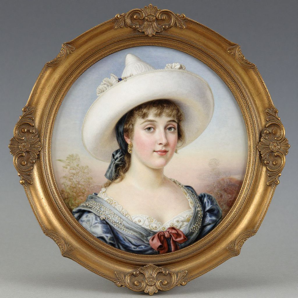 Photograph of an oval, framed, classical portrait painting depicting a fair-skinned woman in a white hat and navy dress with lace trim.