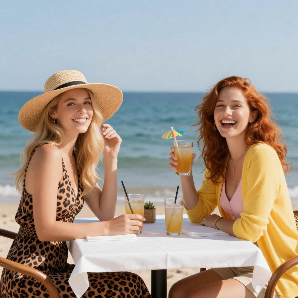 Photograph of two women walking on a sandy beach. The woman on the left has black hair, wears a pink top, black vest, and floral pants, holding a cup. The woman on the right has curly blonde hair, wears a black tank top and pink shorts, carrying a straw hat. Background includes yellow kayak, blue kayaks on rack, and multi-story building. Both smiling.