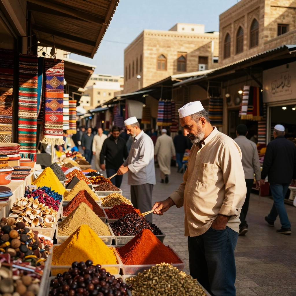 Lebanese traditional market bustling with vibrant spices and textiles, locals in colorful attire, warm golden sunlight casting long shadows, intricate Middle Eastern architecture in the background, rich cultural atmosphere, detailed and vivid.
