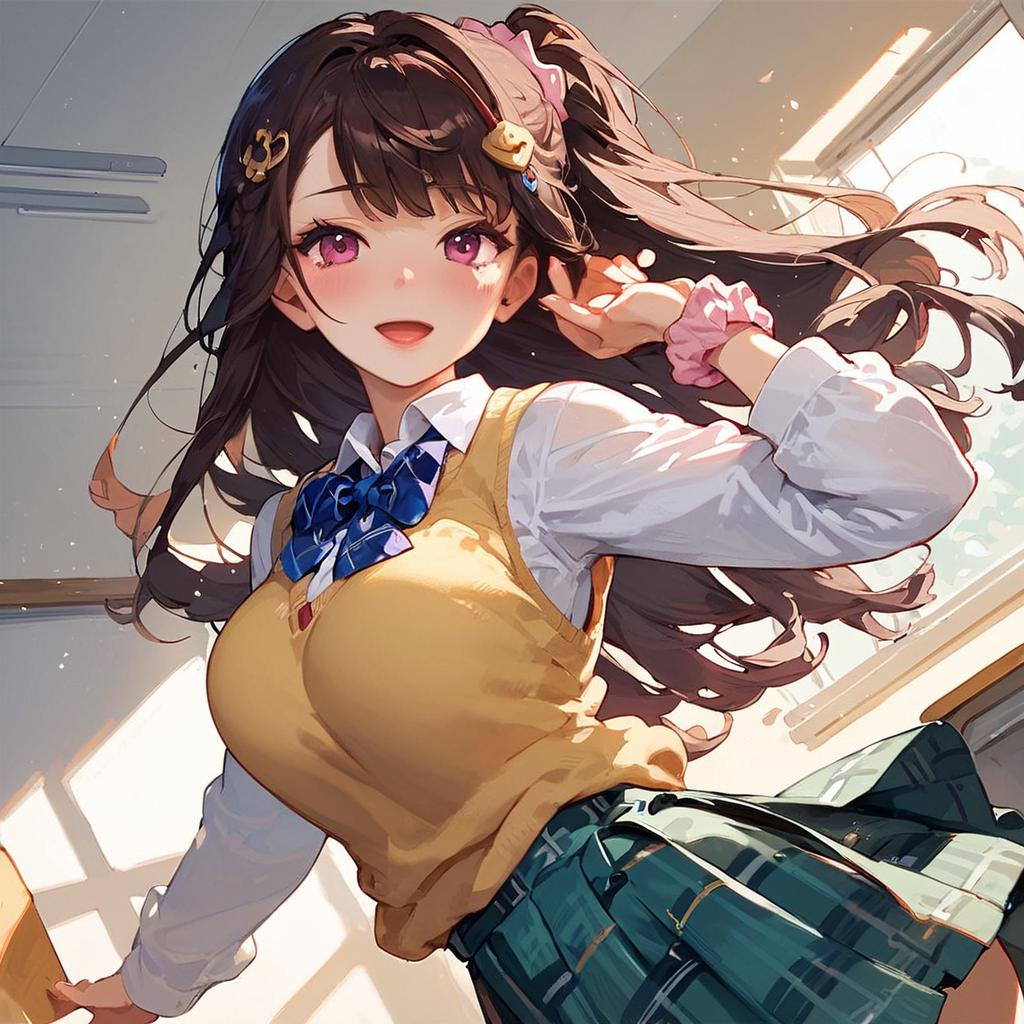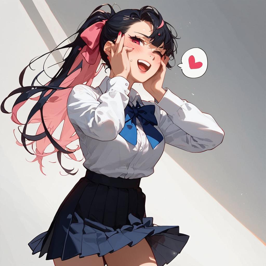 Score_8_up, score_7_up, source_anime, best quality, masterpiece, anime screencap, source_anime, (ai-generated:0.3), ykts, 1girl, solo, black hair, ponytail, laege breasts, seductive smile, open mouth, happy, pink colored hair ribbon, pleated skirt, school uniform, blue bowtie, black socks, spoken heart, hands on own face, standing, in ryokan