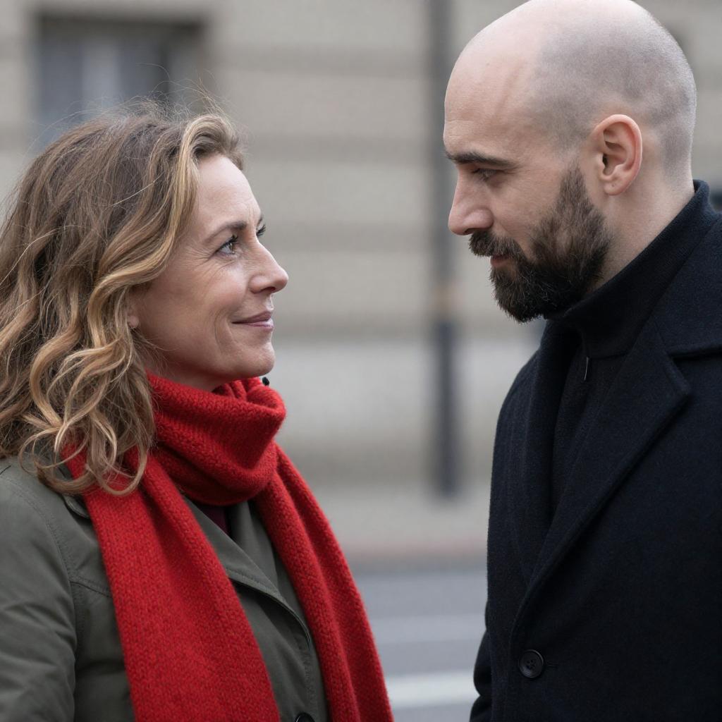 Photograph of two people standing in front of an ornate stone carving. Man with dark blue coat, green scarf, short brown hair, smiling, gesturing with hands. Woman with blonde hair, grey plaid coat, grey scarf, smiling, facing man. Stone carving with intricate carvings of figures and floral patterns in background. Soft lighting.