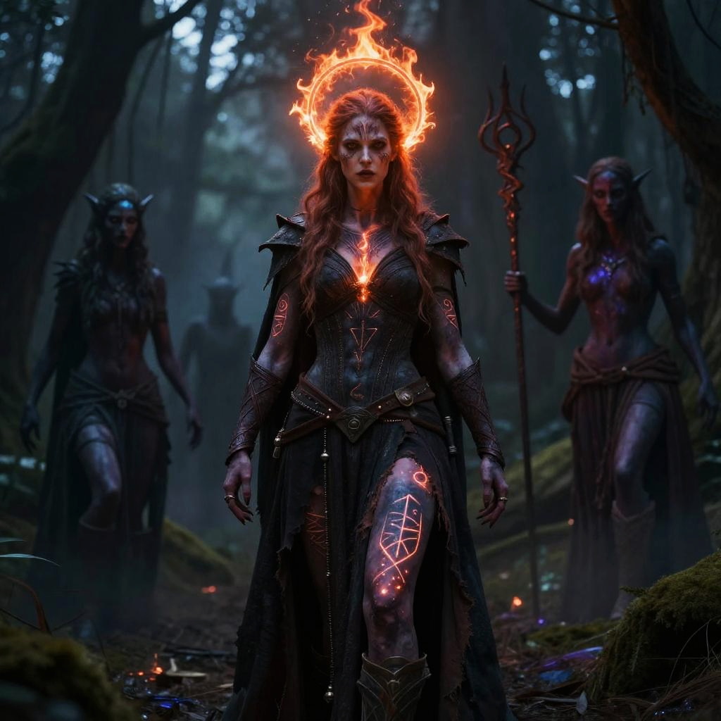 Dark fallen aasimar female warrior in tattered robes, fiery halo fading above her head, surrounded by shadowy spirits, ancient runes glowing on her skin, eerie twilight forest setting