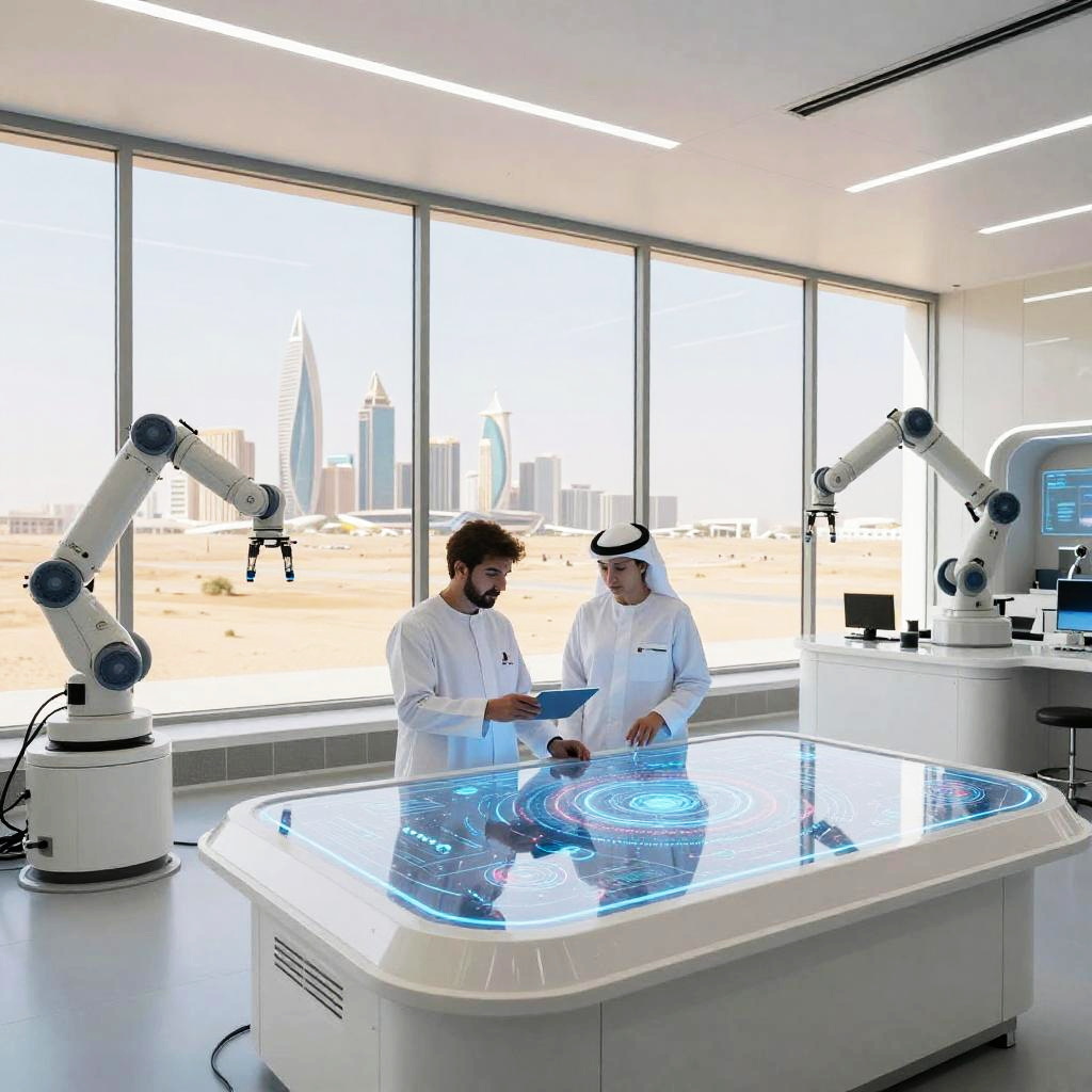 Neom experimental research hub in the desert, scientists working with transparent interactive screens, clean white and metallic interiors, robotic arms and AI interfaces, large windows showing panoramic view of futuristic city and arid landscape, atmosphere of innovation and progress