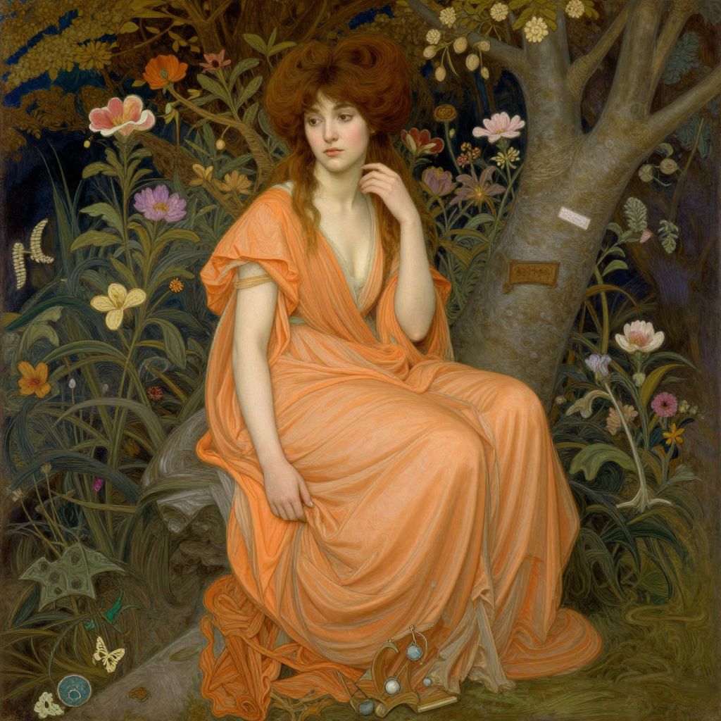 A digitally rendered Pre-Raphaelite-style illustration inspired by Sir Edward Burne-Jones, featuring a serene woman in a flowing orange gown seated amidst intricate floral and tree motifs, evoking a vintage, romantic atmosphere with detailed brushwork and soft, ethereal lighting.