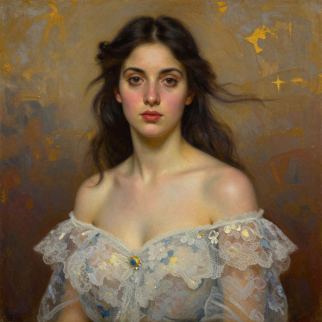 A digitally rendered portrait in the style of Russian figurative painter Maria Kreyn, featuring a woman with dark, flowing hair adorned in a delicate off-the-shoulder dress embellished with floral lace, set against a textured, painterly background with warm, golden accents.