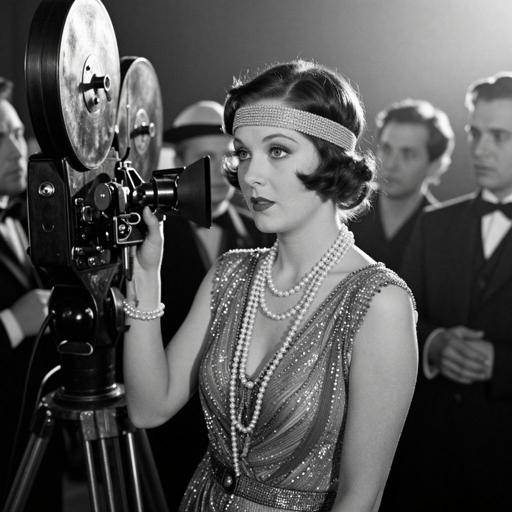 1920's silent film star on set, dressed in a glamorous flapper costume with pearl necklaces and headbands, vintage film cameras and crew in the background, black and white cinematic style with grainy textures and dramatic lighting.