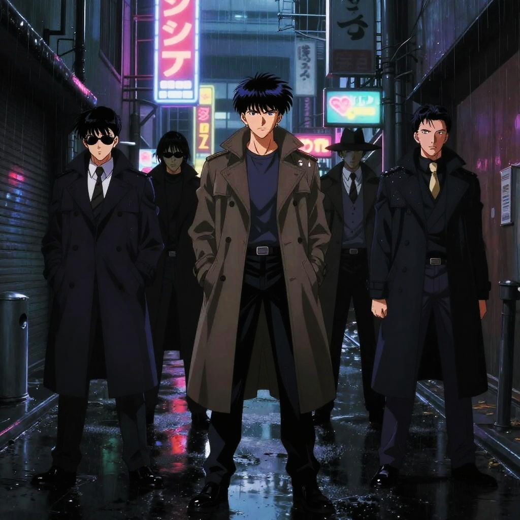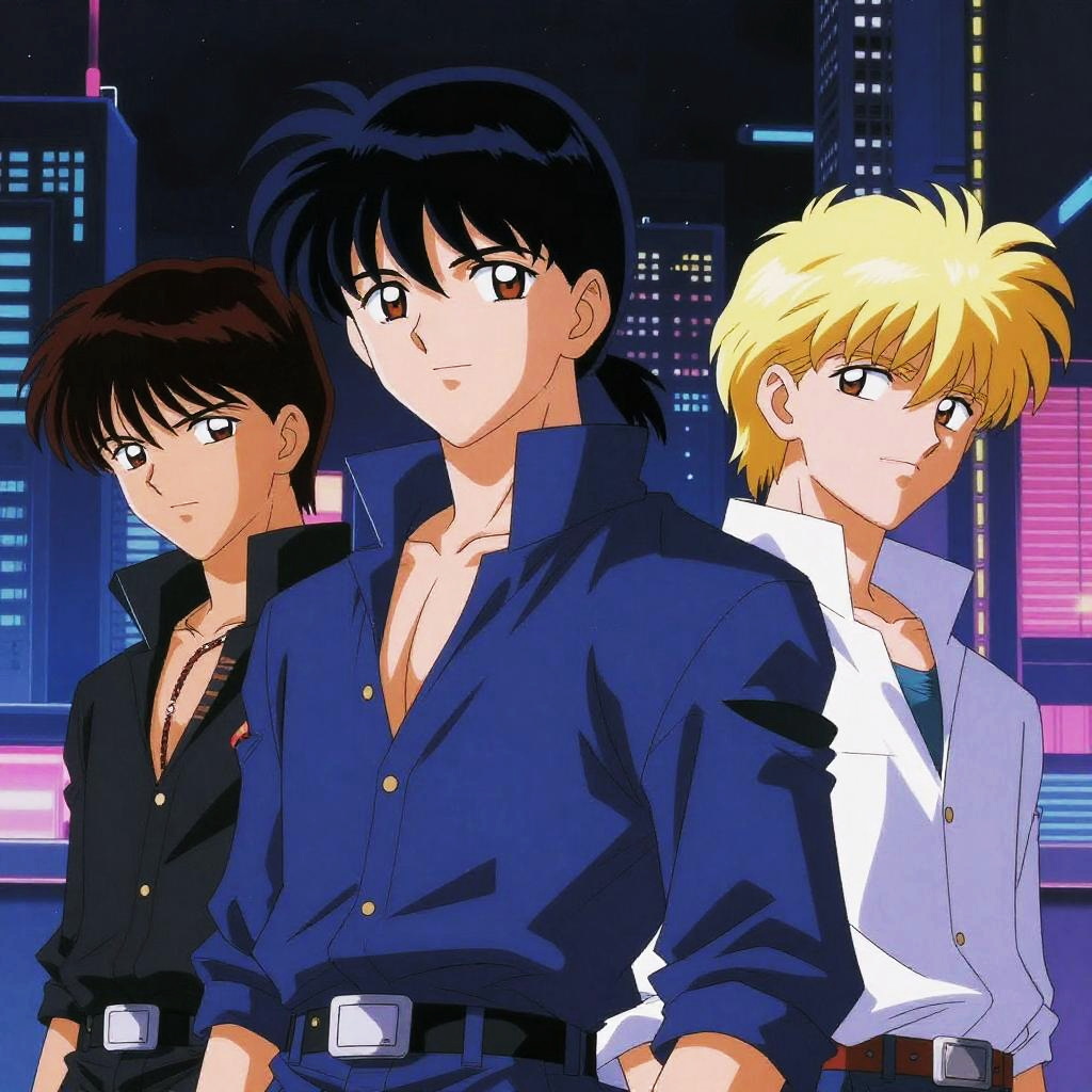 90s anime men standing in a neon cityscape at night, sharp angular features, vibrant hair colors, classic anime shading, retro cyberpunk vibe, detailed expressions