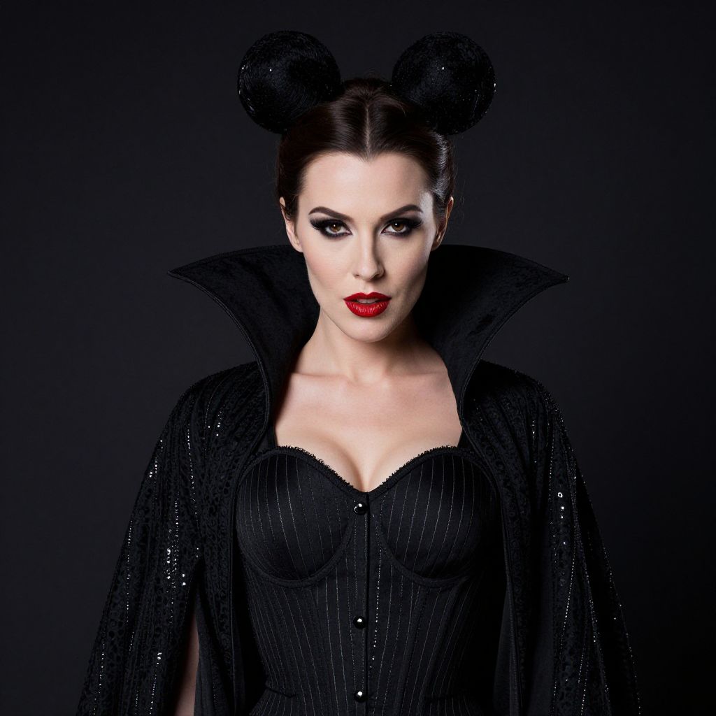 A woman dressed as a Disney villain poses in a photorealistic dark glamour portrait, showcasing a dramatic black costume with high, pointed collar and pinstriped corset. Her makeup features bold red lips and smoky eyes, with hair styled into two round buns resembling iconic mouse ears.