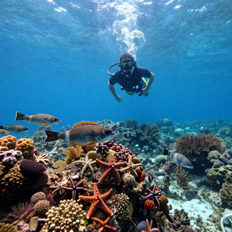 A snorkeler in a reef with a variety of marine life including parrots and sea stars, bright sunlight filtering through the water, natural colors, realistic underwater shot