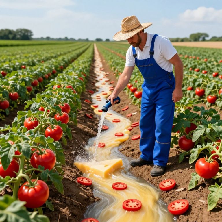 Farmer in sky-blue overalls and a straw hat waters a surreal field where cheese rivers flow between rows of vibrant red tomato plants, with pepperoni slices scattered along the path, creating an imaginative blend of agriculture and culinary whimsy.