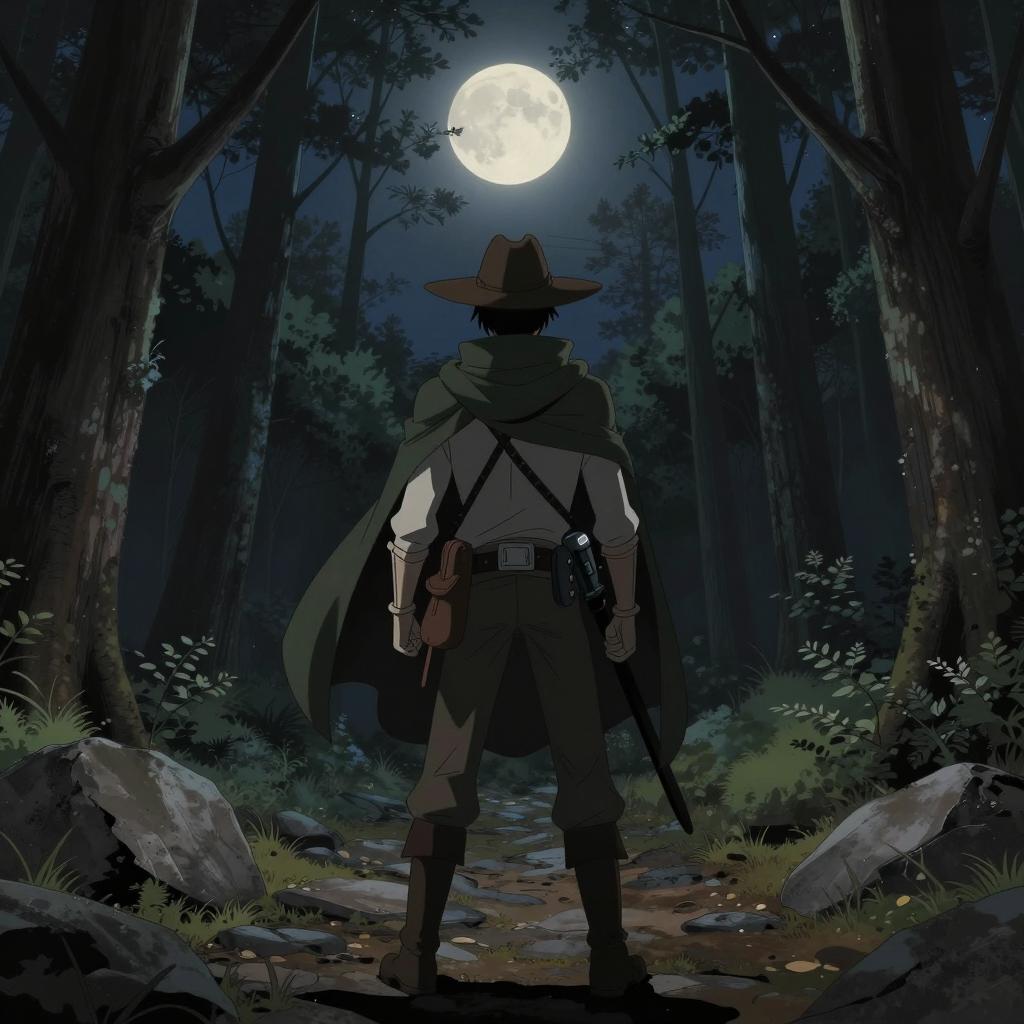 Illustration of a lone ranger wearing a faded cloak and wide-brimmed hat, standing on a rocky path in a shadowy forest. The scene is illuminated by a bright full moon and surrounded by tall trees under a night sky with subtle stars. Rendered in a dark, emotionally charged anime style reminiscent of Kentaro Miura.
