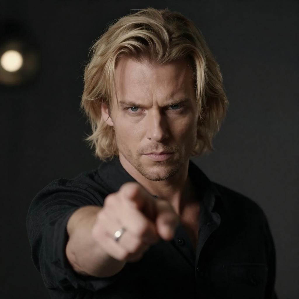 Photograph of a blonde man with shoulder-length hair, intense gaze, and serious expression, wearing a black shirt, pointing forward with his right hand, displaying a silver ring on his index finger. Dark, blurred background with bokeh lights.