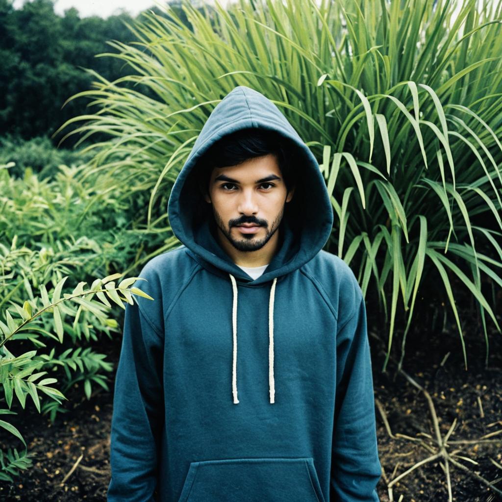 Portrait of a young man with black hair and facial hair wearing a blue hooded sweatshirt with the hood up, standing outdoors surrounded by green plants and foliage. The man is looking directly at the camera with a serious expression.