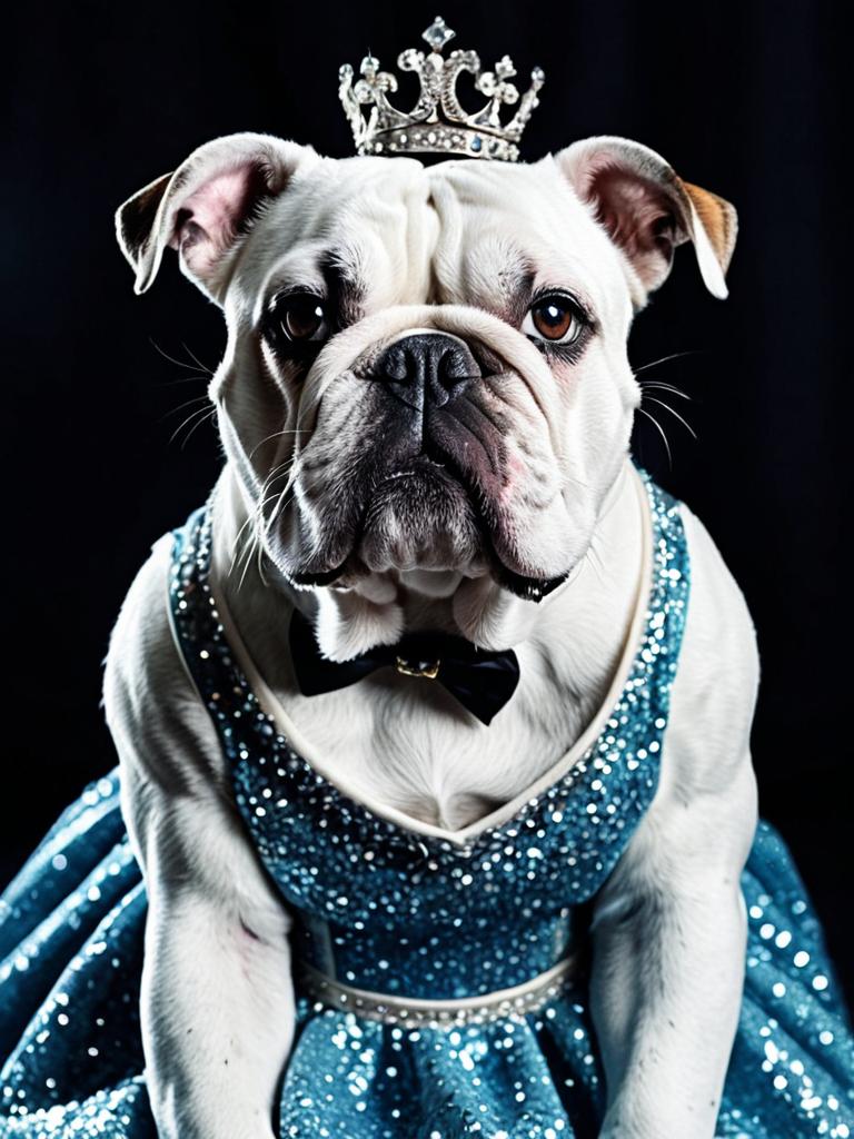 Bulldog in Queen Sparkles Dress, detailed pet cosplay portrait, photorealistic realism