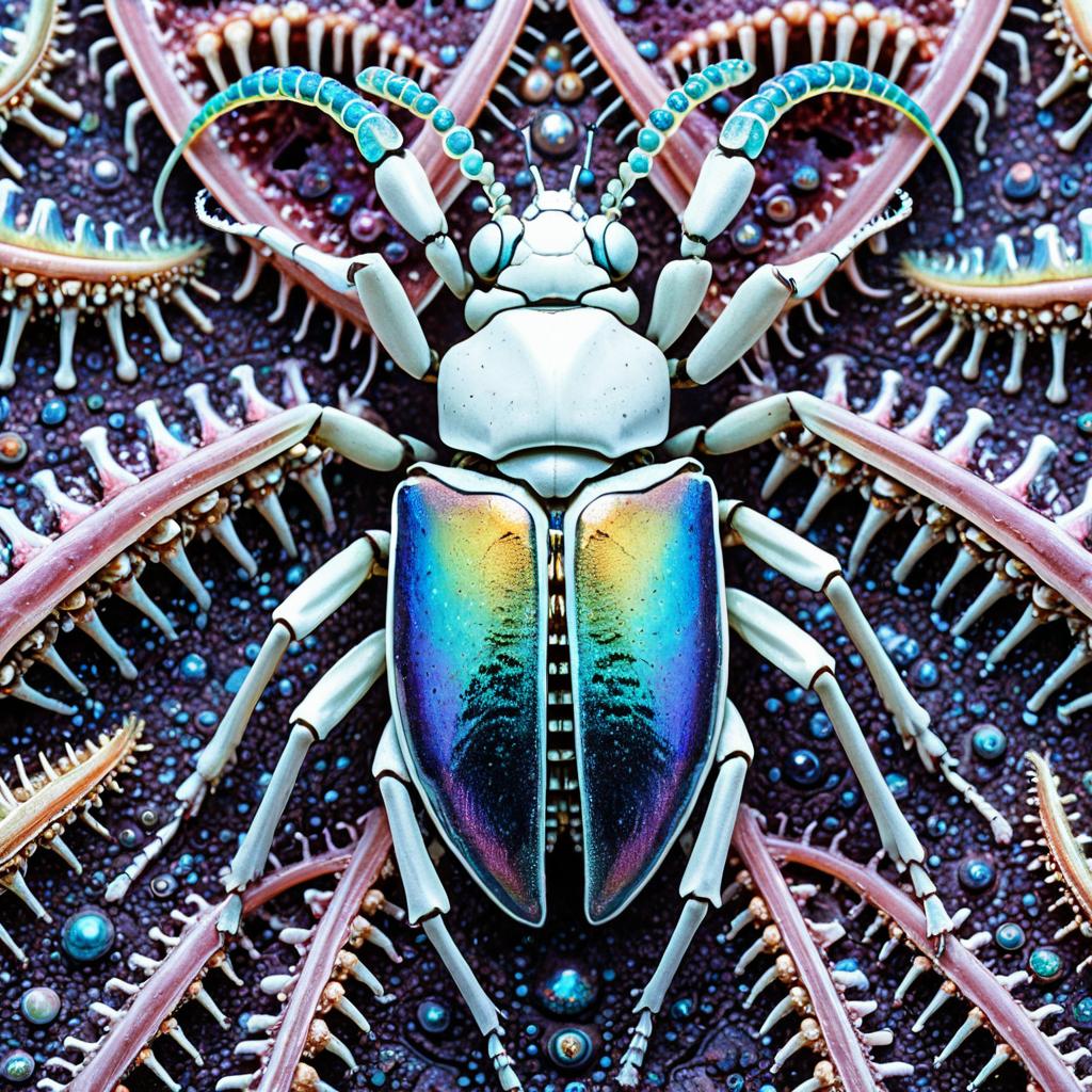 Ultra hyper-realistic and super textural image of a surreal psychedelic crystalline beetle featuring bright pastel oil slick rainbow colors on its translucent wings. The beetle is set against a complex background of gyroid structures, Pascal's Triangle-inspired patterns, rows of human teeth, and intricate fungal textures, atoms, and diatoms, creating a highly detailed, trippy visual effect.