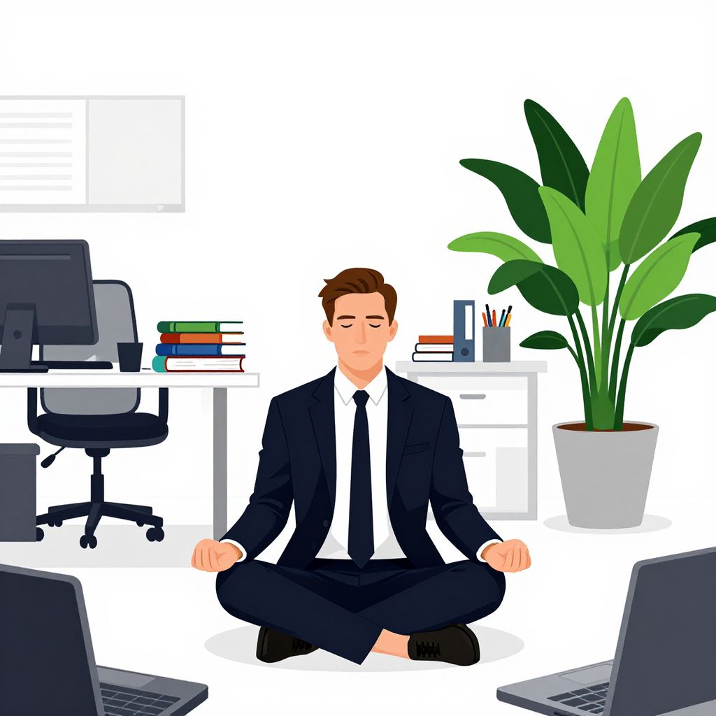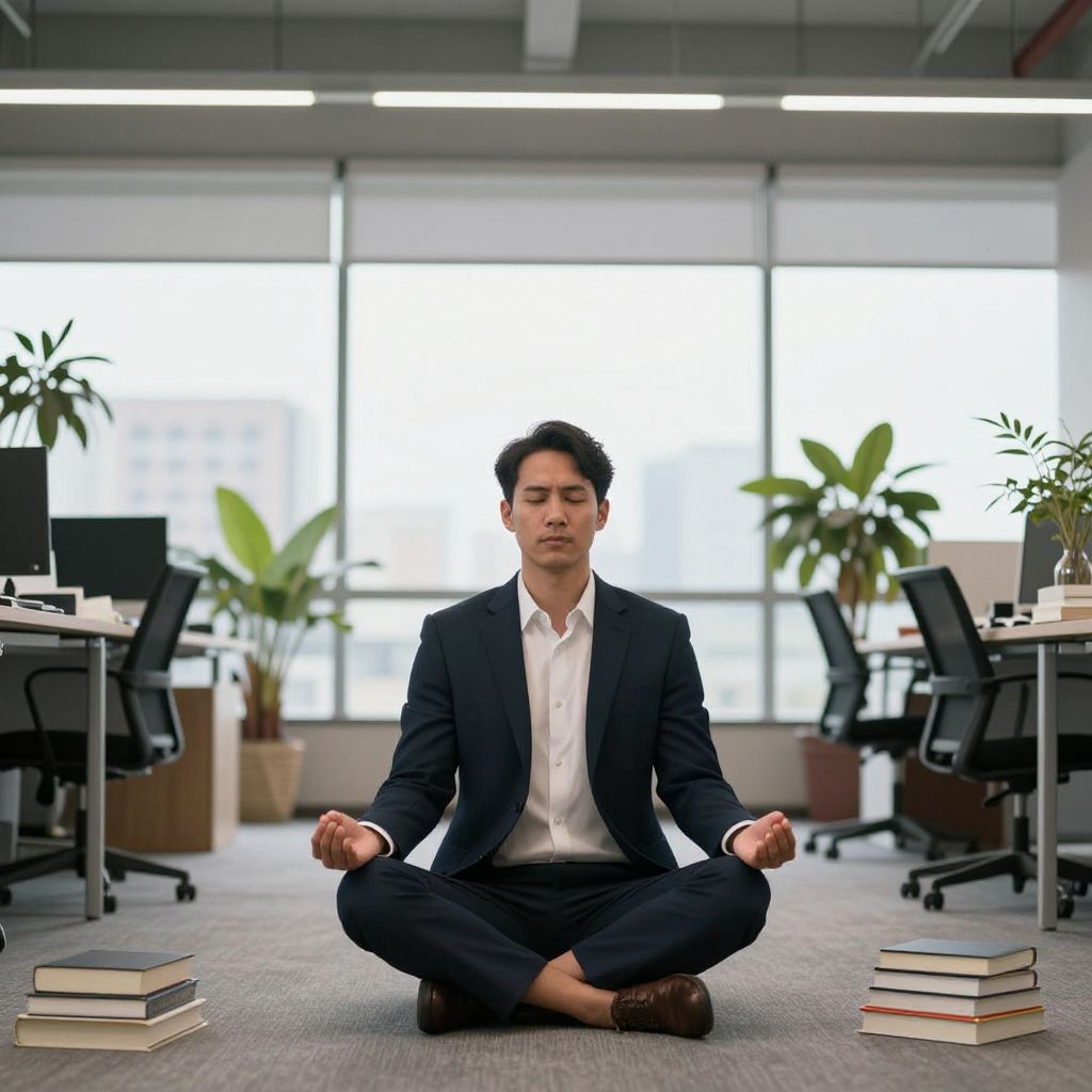 A man in a suit sits in a lotus position meditating in an open-plan office, surrounded by books and plants, with a cityscape visible through the windows.