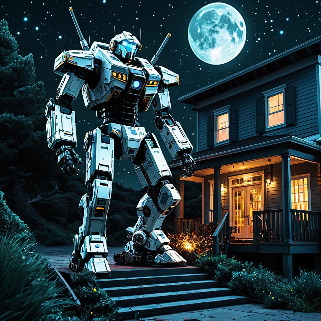 Highly detailed digital art of a white mech warrior standing on outdoor stairs at night. The mech features angular armor, antenna-like protrusions, and a glowing blue chest light. The scene includes a full moon, starry sky, surrounding houses, and foliage, rendered in a sci-fi style with a cool blue monochromatic color scheme.