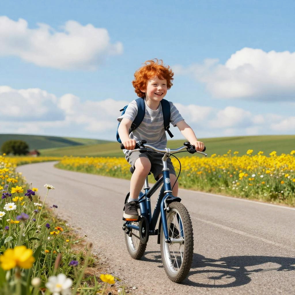 Red haired boy riding a bicycle down a sunny country road lined with blooming wildflowers, carefree and happy expression, blue sky with fluffy clouds, detailed landscape with rolling hills in the background, vibrant and lively atmosphere