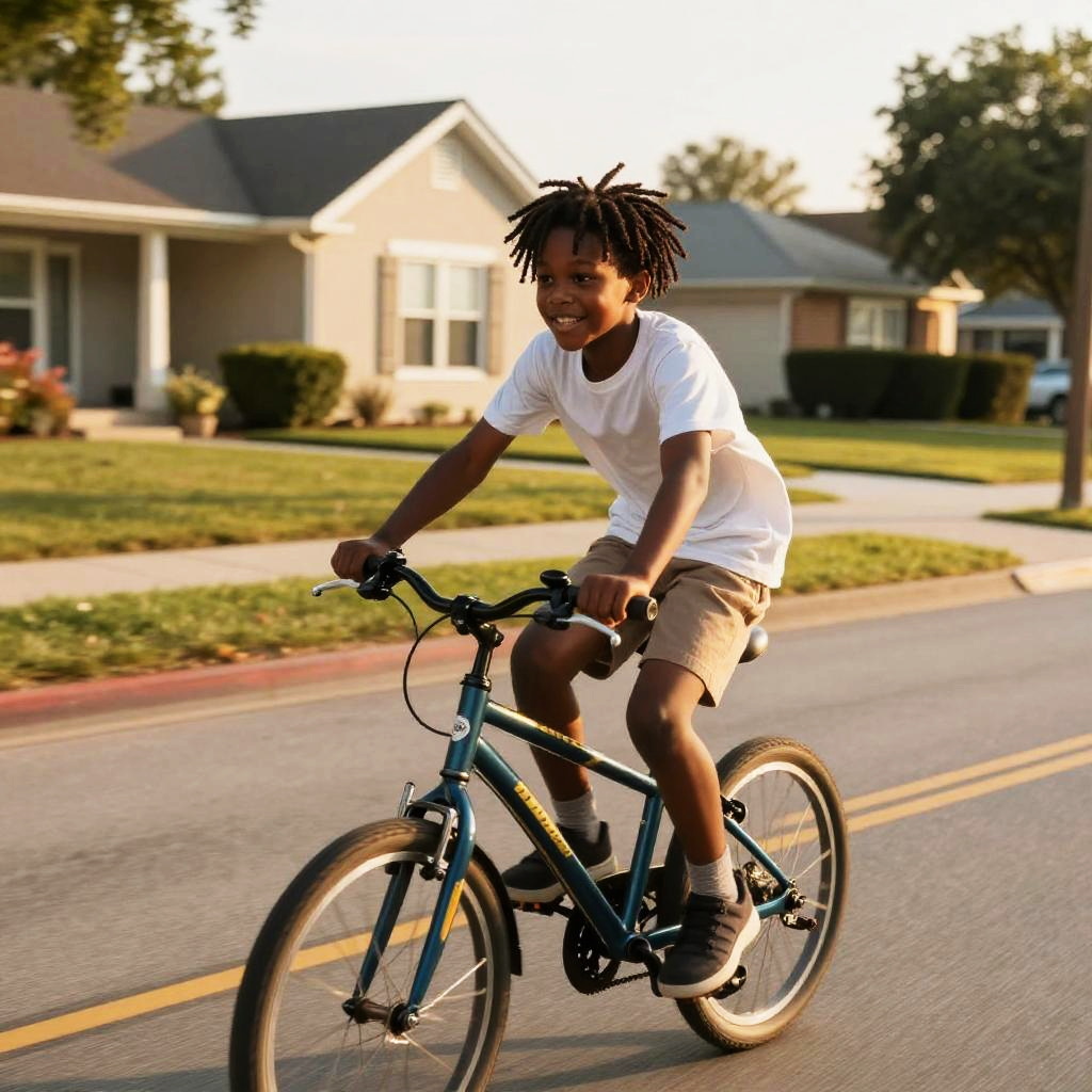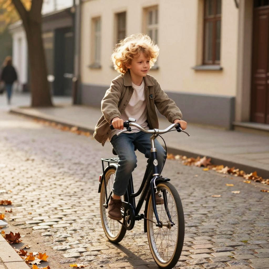 Photograph of a red-haired boy with curly hair, wearing a white shirt, gray shorts, and backpack, riding a blue bicycle on a sunny,