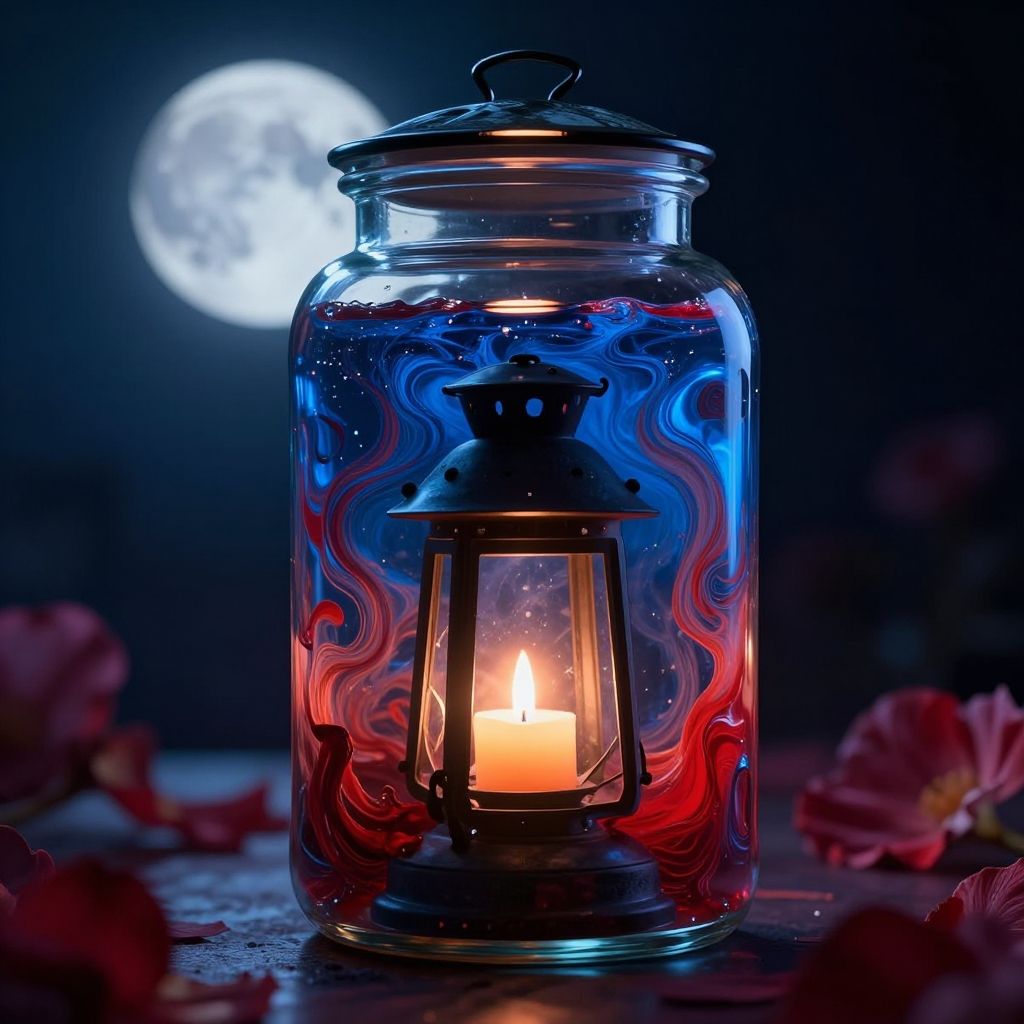 Life in a glass jar with swirling blue and red liquid. intricate, hyper detailed, ultra realistic, sharp focus, octane render, lantern candle volumetric, ray tracing by greg rutkowski, sci - fi, bladerunner, 8 k, artstation trending, moon, flowery petals background, sense of awe, mystical, moon. art by artgerm and