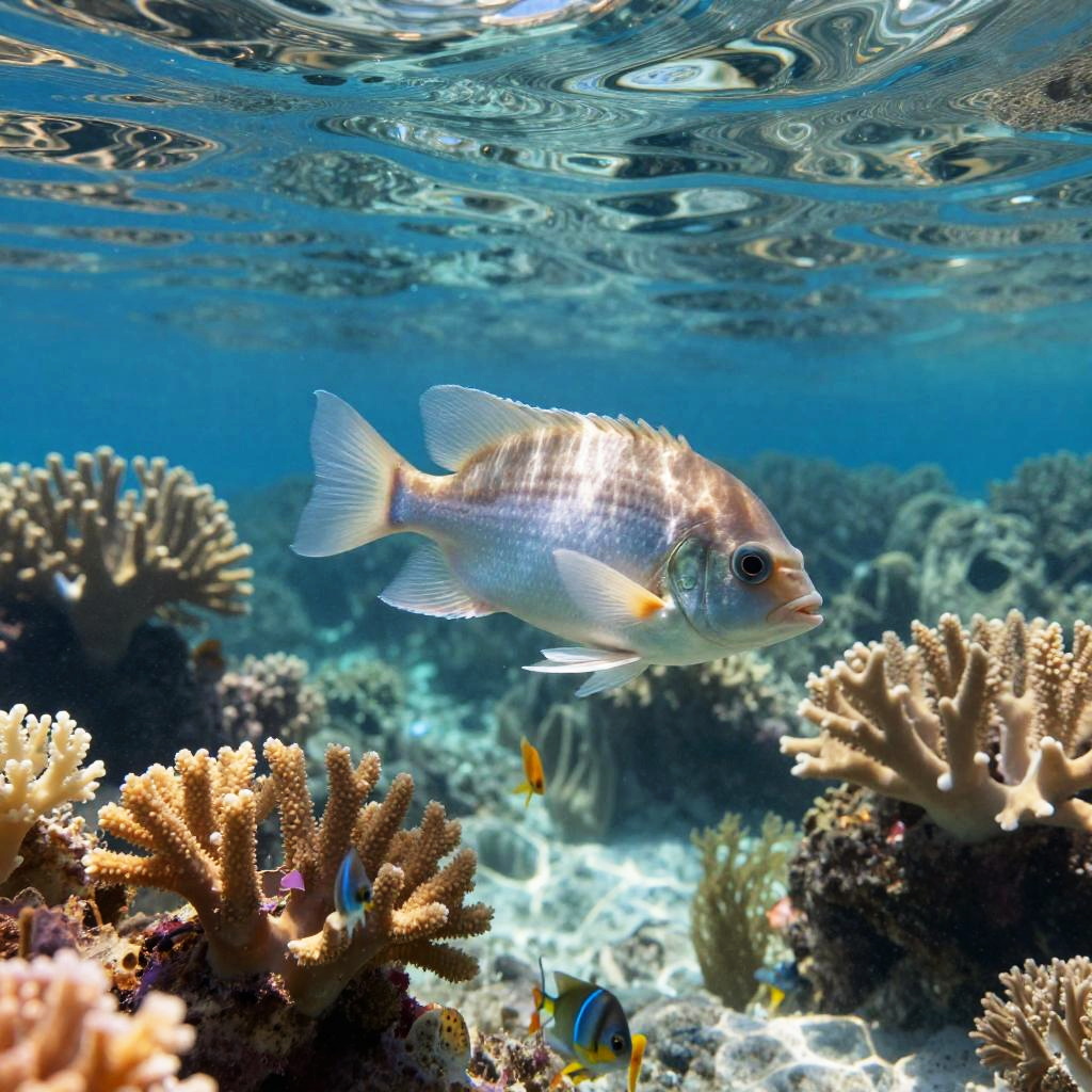 Photograph of a large, grayish-blue fish with red eyes and a spiny dorsal fin swimming near a coral reef underwater. The background shows clear blue water with sunlight filtering through. The reef is littered with various colorful plastic waste, including a green bottle, white plastic, and other debris. Bubbles rise from the fish's mouth, and the coral features corals and sea anemones. The fish's mouth is slightly open, and its scales glisten in the light. The image highlights the contrast between marine life and pollution.